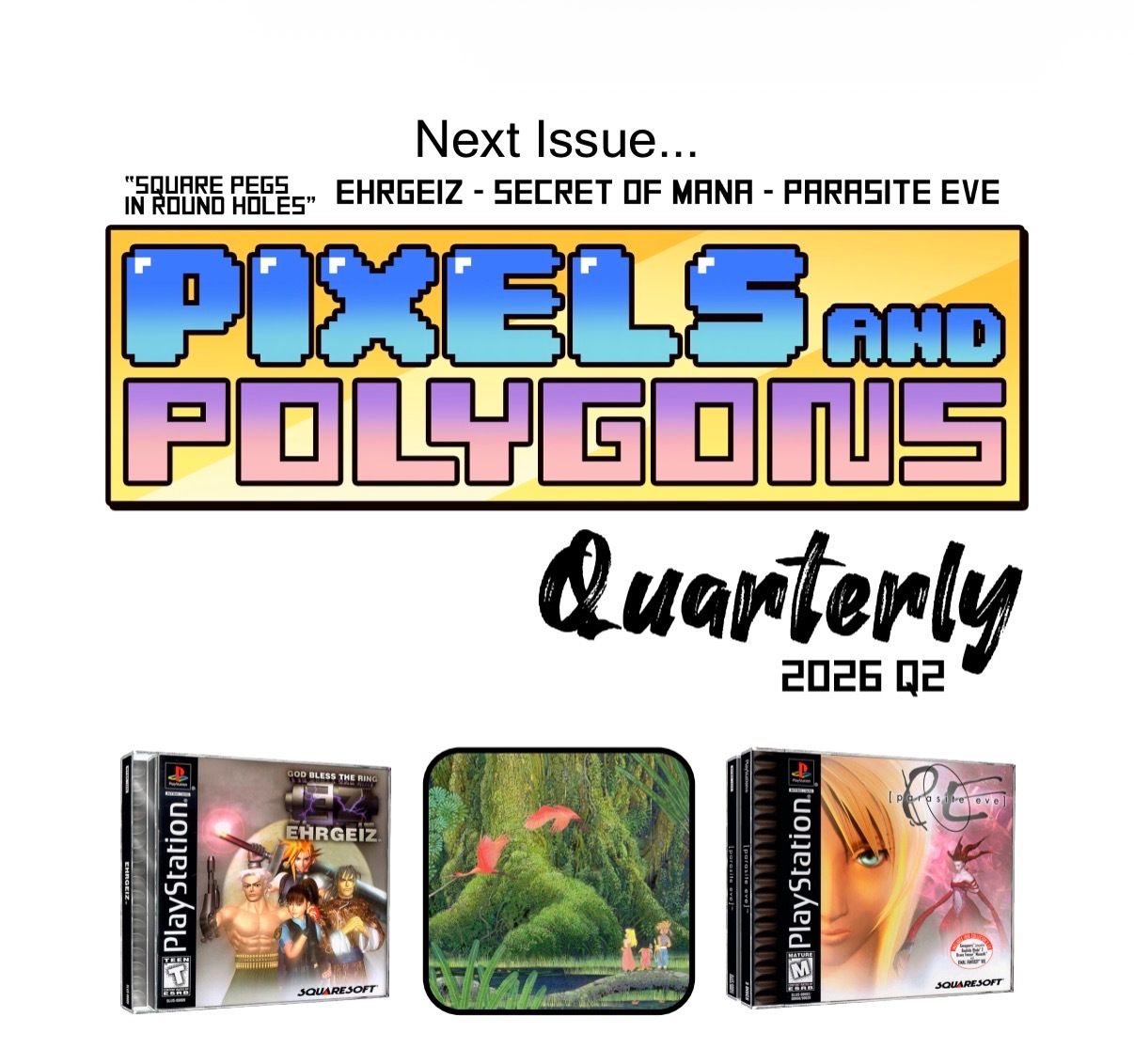 Up next is Pixels and Polygons Quarterly! Issue one is complete and being printed here any day now. It has come together better than I originally envisioned, with extra content like the “Pencils and Polygons” comic drawn by Maddie, aka ohthatsraspberry. I am also happy to have more writing on it. Each issue has an overall “theme,” so having a story that ties to this theme as a connective tissue for the issue is something I am proud of. Issue two is already in production with another group of great writers. Nadia Oxford (Axe of the Blood God, frequent Retronauts guest, and so much more!), Brendan Hesse of The Crawl, and Alex Johnson. This next issue will be “Square Pegs in Round Holes.” It’ll cover a few less popular Square titles that are fan favorites.